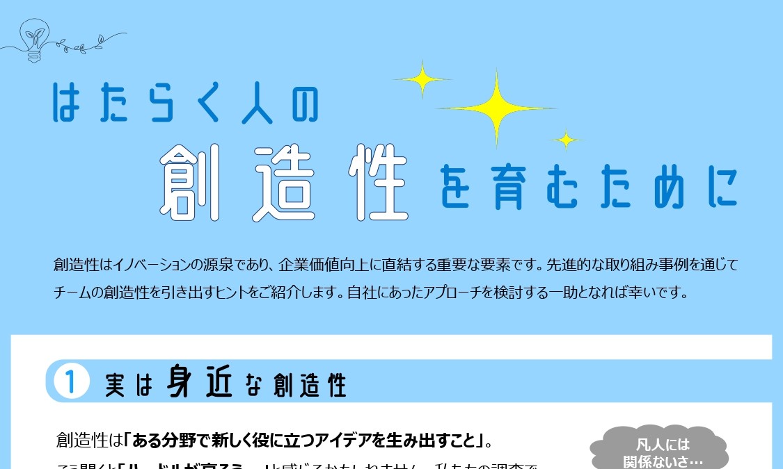 チームメンバー全員でリーフレットを見ていただき、創造性を高めるために「自分たちにできること」を話し合ってみてはいかがでしょうか。